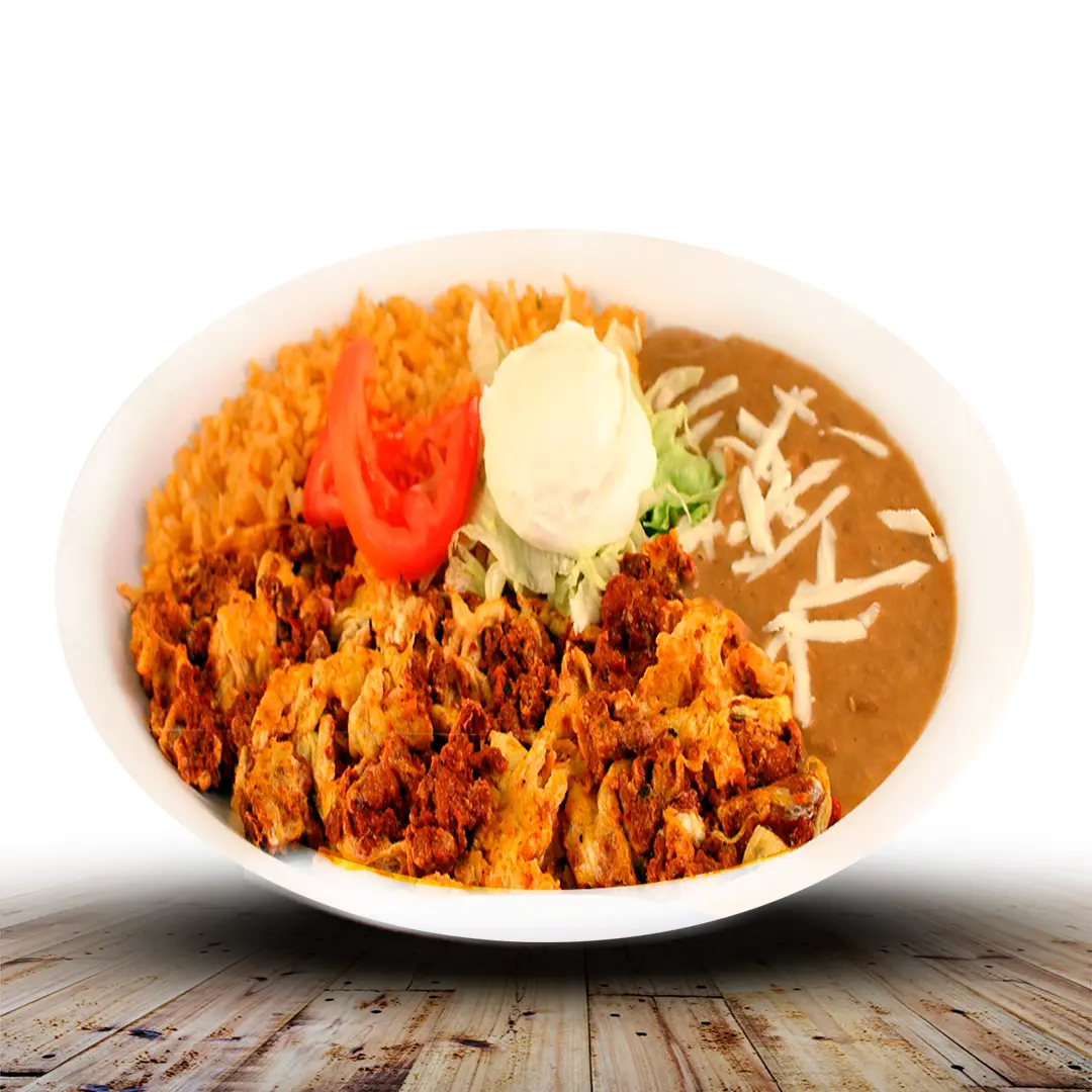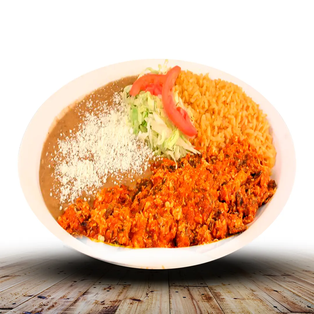 Huevo revuelto con carne deshebrada estilo norteño, acompañado de arroz y frijoles.